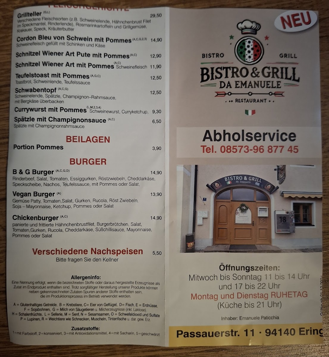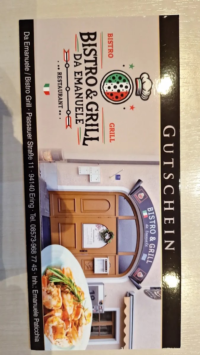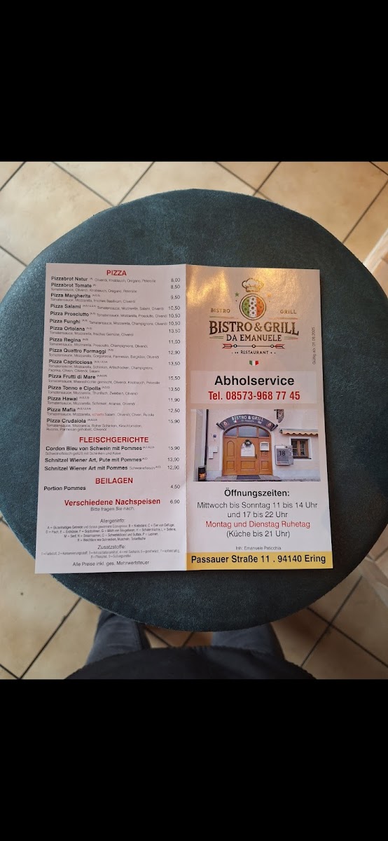 The menu at Bistro & Grill Da Emanuele features a range of Italian cuisine with a focus on classic dishes such as pasta and pizza. Visitors can expect options suitable for lunch and dinner, with selections that accommodate casual dining occasions as well as takeaway orders.